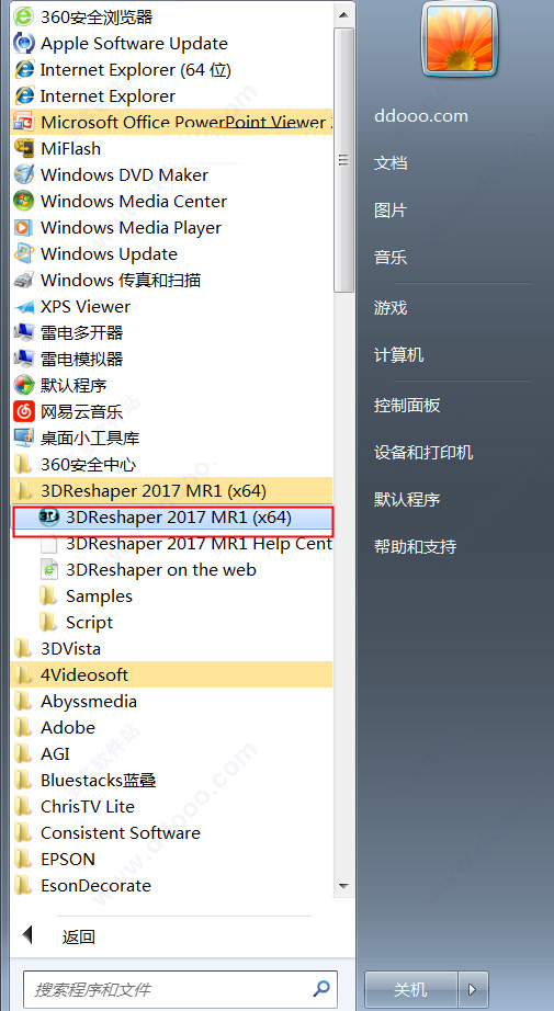 1、安装原程序后不会再电脑桌面自动生成快捷方式,因此我们点击“开始”便可看到“3DReshaper 2017 MR1 (x64)”鼠标双击运行即可。