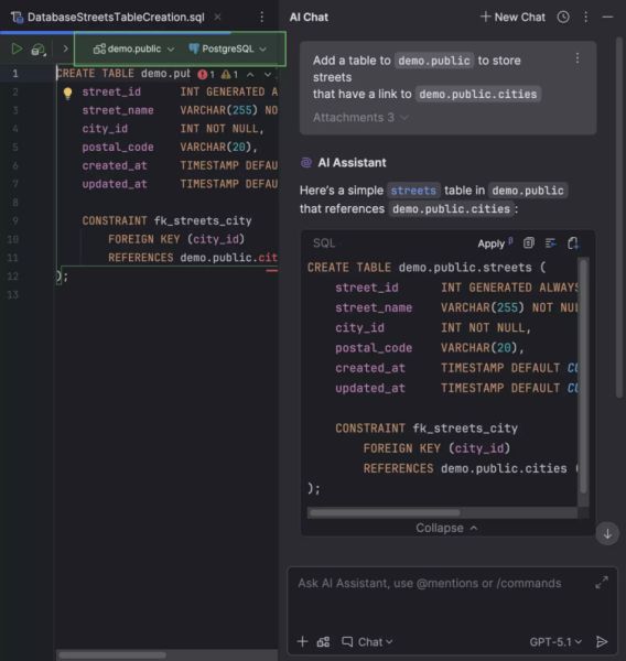 如果在聊天中提供了与 SQL 方言、数据源或架构相关的任何上下文,则无需附加数据源或架构,也无需设置方言,因为 DataGrip 会自动完成这些操作。 同样,如果您向 AI Assistant 询问有关已附加数据源的文件的问题,DataGrip 会将该数据源附加到新创建的文件中。