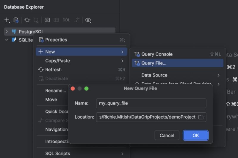 DataGrip 会将创建的文件存储在当前项目目录中。