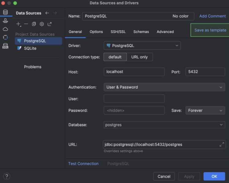 您可以在 Data Source and Drivers(数据源和驱动程序)对话框中创建模板。 在 Data Sources(数据源)标签页上,选择创建模板要采用的数据源,然后点击 Save as template(另存为模板)。