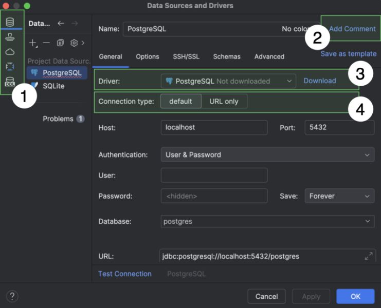 我们已实现一种方式,支持将数据源设置以模板形式存储在您的 JetBrains Account 中。 通过这种方式存储数据源设置后,您在任何提供数据库功能的 JetBrains IDE 中登录 JetBrains Account 后,都可以使用该模板。 这些模板会存储 Data Source and Drivers(数据源和驱动程序)对话框 General(常规)和 Advanced(高级)标签页中的设置,但不会存储您的数据库凭据。