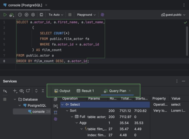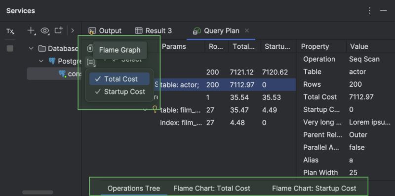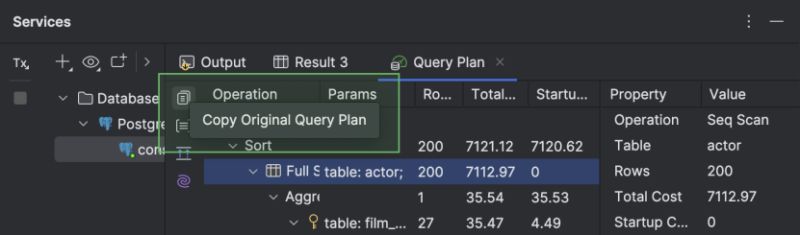 在 Services(服务)工具窗口中,显示计划的 Query Plan(查询计划)标签页已移至与 Output(输出)和 Result(结果)标签页相同的级别。 该标签页还采用新图标。