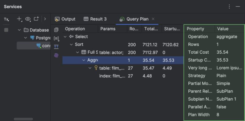 在 Query Plan(查询计划)标签页中,您现在可以在标签页右侧的单独面板中查看每个计划行的详细信息。