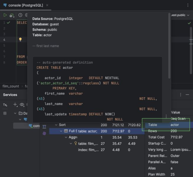 DataGrip可以正确解析SQL代码中的所有引用,并帮助您重构它们。当您重命名变量或别名时,它将在整个文件中更新其用法。当您从查询重命名对它们的引用时,数据库中的实际表名将被更新。甚至还可以预览其他视图,存储过程和函数中的表/视图。