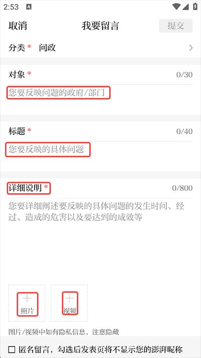 4、选择后输入留言的部门及内容,还可以上传图片和视频。