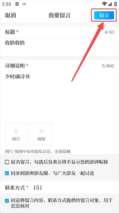 2、编辑页面输入报料标题,报料内容,以及相关的图片资料,接着点击右上角【提交】,即可完成投稿。