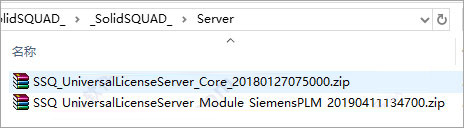 2、首先解压_SolidSQUAD_.7z文件;得到下列文件:SSQ_UniversalLicenseServer_Module_SiemensPLM_20190411134700.zip