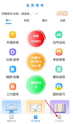 1、打开全安驾考,可进行注册登录,可以进行免费体验或选择一项进行学习;