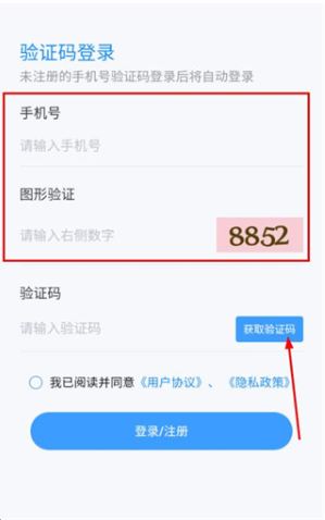 在手机验证登录界面输入手机号码和图片验证码,勾选相关协议后,点击“获取验证码”按钮。