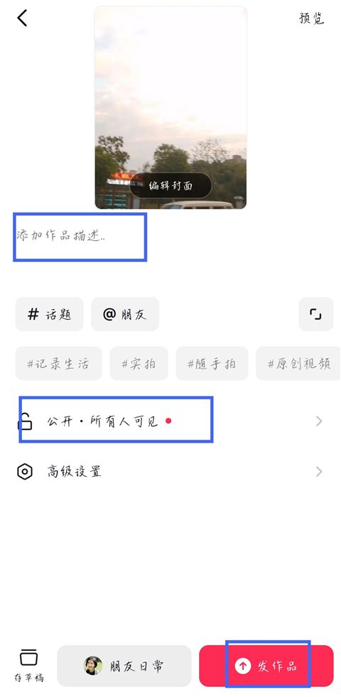 5、输入作品介绍以及选择可见范围,点击【发作品】即可。