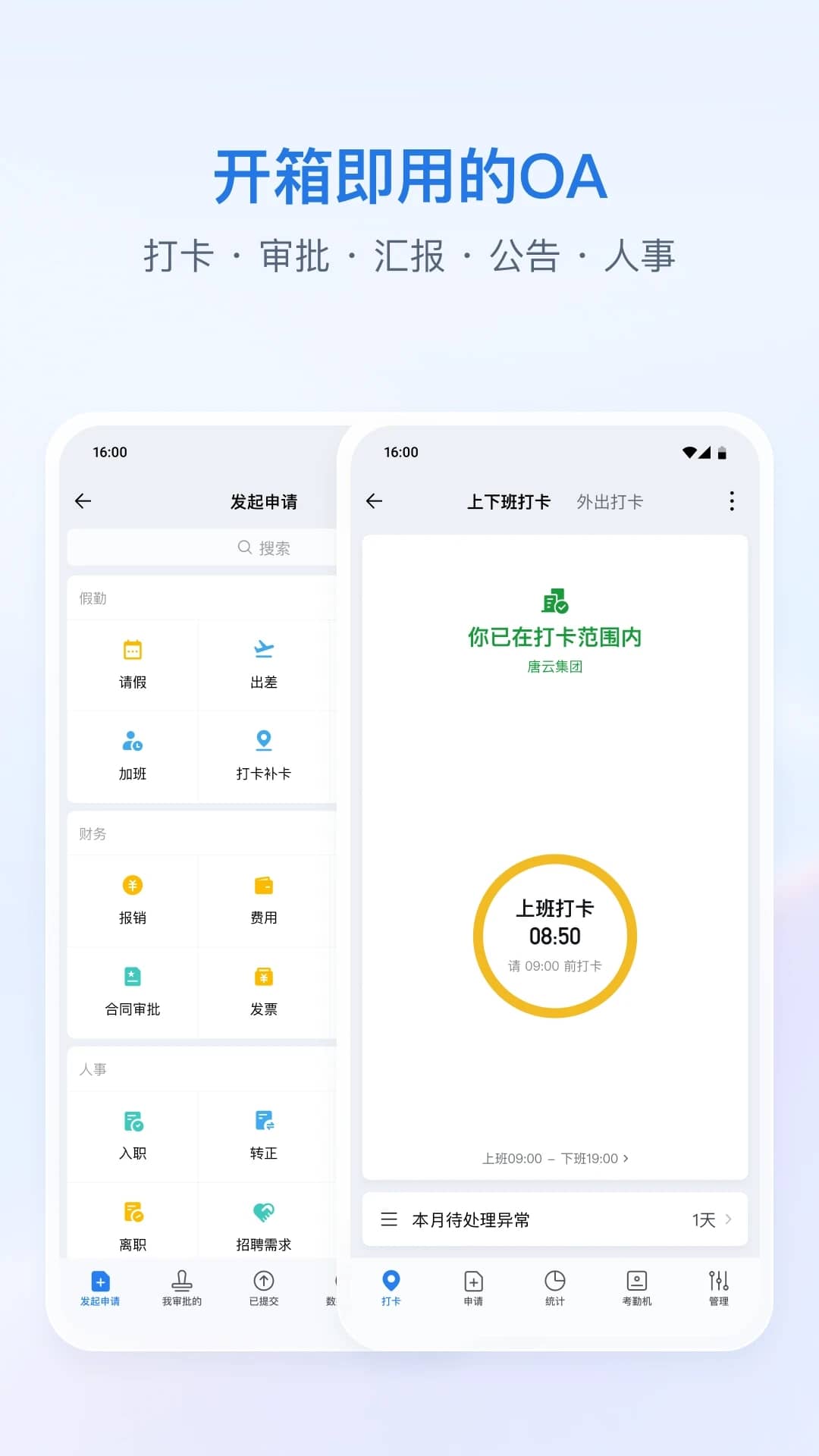 【OA应用】预设官方提供的打卡、审批、汇报、公告、会议室、同事吧等灵活易用的OA应用。