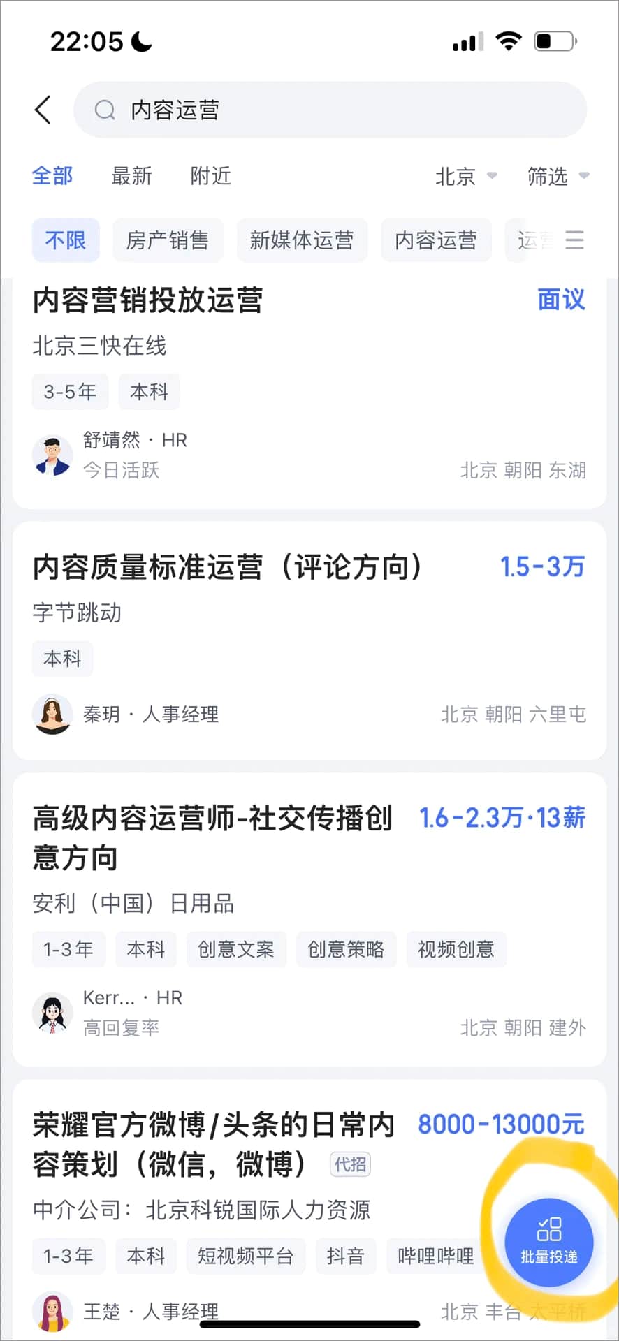 1、在首页的“搜索栏”里输入“职位”,如内容运营,然后右下角会出现“批量投递”的蓝色小圈圈,点它
