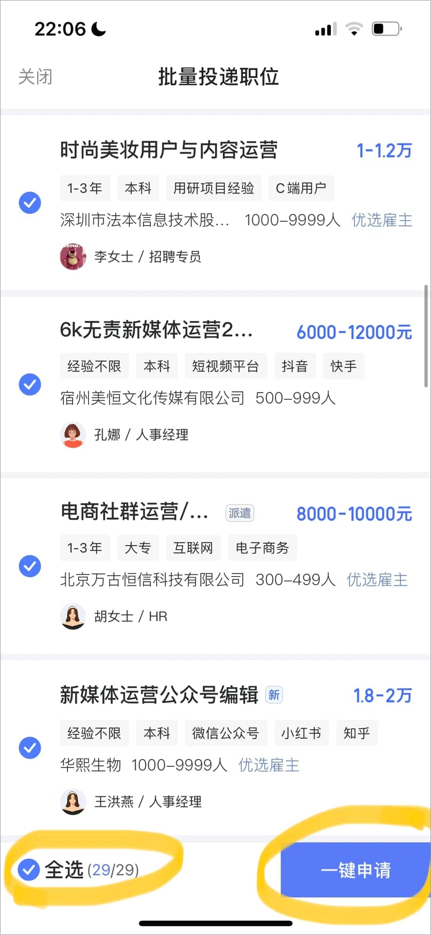 3、智联招聘是我用起来最便捷的一个投递软件。这30家投完你换个关键词,比如用户运营,再批量全选投递,又投30家,这样一天可以投200多家。面试其实不只是被筛选,我们求职者也在积极地利用这个机会去完善自身,把经验迁移到更需要的地方。