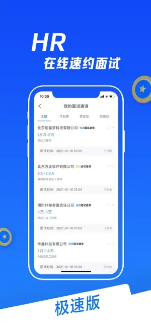 智联招聘极速版是当下求职招聘最实用的软件了,基本当代刚毕业的大学生都在使用,找工作非常方便,并且会根据你的求职意向进行推荐,线上写简历也很方便。HR在线速约面试,你的面试邀请一目了然,随时随地线上聊,找工作不再盲目等待,含有海量高薪职位,优质名企,让你快速找到好工作。