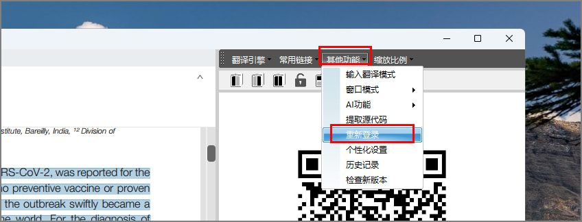 大部分情况下不会使用到这种方法,因为偶尔出现扫码后不跳转到登录成功页面时,都可以通过点击软件右上方菜单:其他功能-重新登录,产生新登录二维码重新扫码登录。核心在于产生新的登录二维码再扫码。如果您扫码始终不跳转。可采用验证码登陆途径。