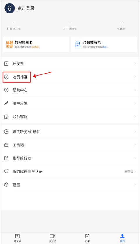 想要了解讯飞听见APP的收费标准的话,我们就需要进到个人中心界面,通过下方列表中的“收费标准”查看到非常详细的介绍。