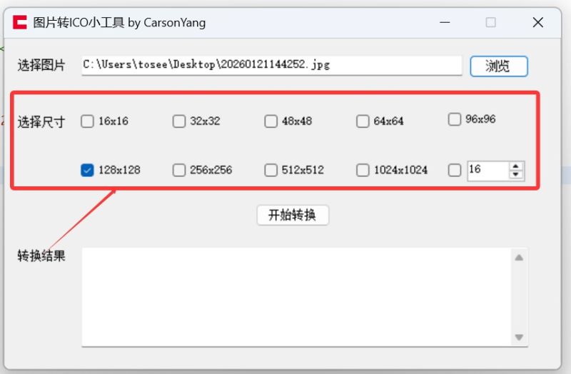 4、也可以设置128*128尺寸,勾选一个尺寸就可以转换