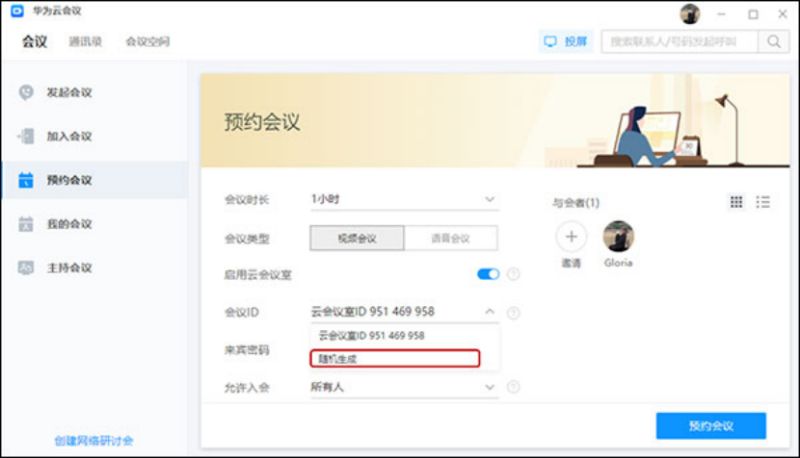云会议室-随机会议ID:绑定了云会议室的用户,不仅可以选择用固定ID预约会议,也可选择随机ID预约会议,