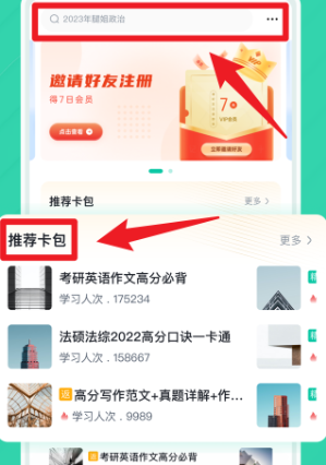 2、软件内可在搜索框输入关键词查找学习资料,同时下方“推荐卡包”会智能推荐热门学习内容,点击即可快速开始复习。