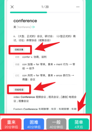 3、在页面中,支持查看词义、词根和词组短句,还可通过点击“简单、一般、困难、重来”等按钮自定义复习周期,科学记忆更高效。
