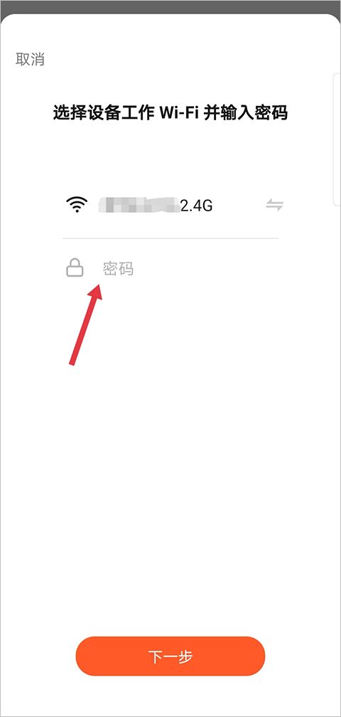 选择家中2.4GHz的Wi-Fi频段,并输入网络名称及密码,让设备连接网络。