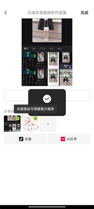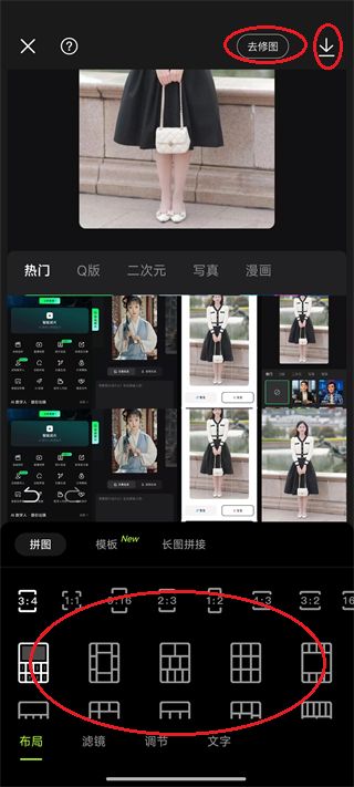 3、在屏幕下方选择拼图的样式,完成后,点击屏幕右上角的“下载”或者“去修图”,随后保存即可。