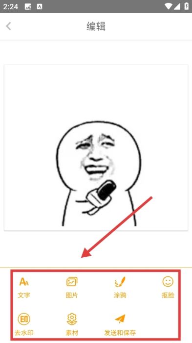 4在编辑界面中,你可以借助文字、图片、涂鸦等工具来编辑表情,编辑完成后就能执行发送和保存的操作了。
