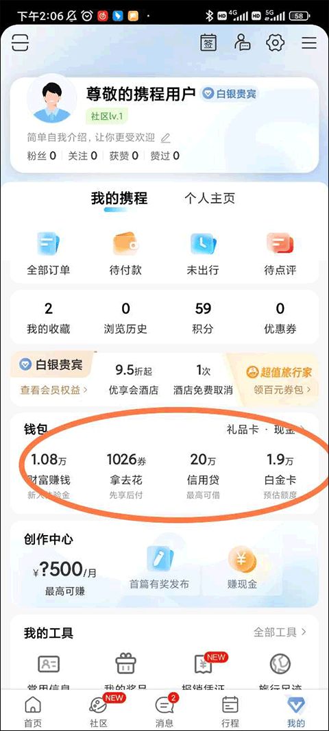 首先我们先进入到个人主页,我们可以看见有许多功能区域,分别是钱包,创作中心,我的工具等,这个时候我们需要点击钱包这个区域进入钱包界面;