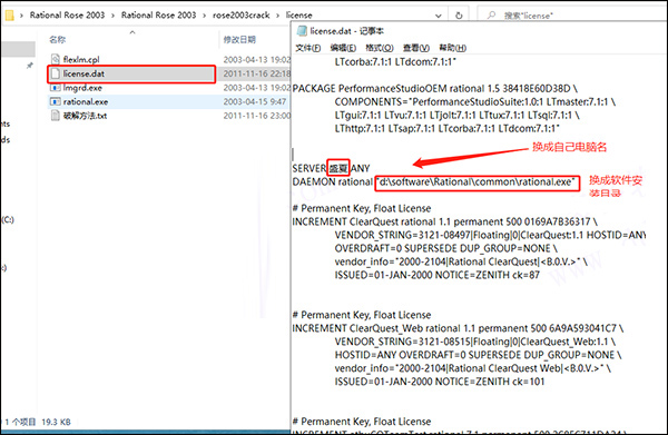 7、双击找到crack文件夹中的“license、dat”用记事本或者是Notepad++打开,按照图中指示更改计算机名,和Rational软件安装路径;