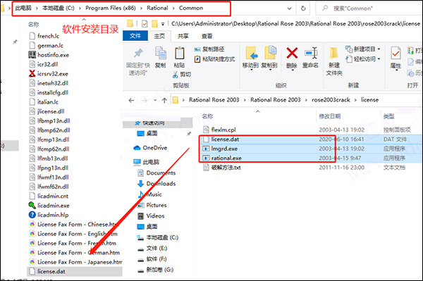 8、将license、dat、 lmgrd、exe 、rational、exe三个文件一起拷贝到:软件安装目录/rational/common/ 下面;