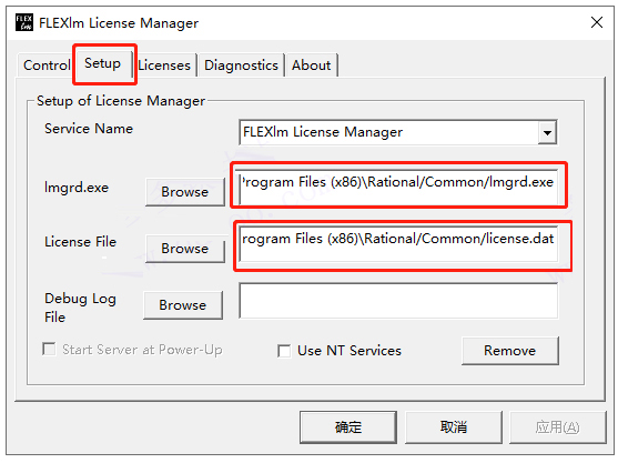 10、选择第二个Setup页中,将lmgrd、exe右侧目录写为:安装目录/Rational/Common/lmgrd、exe,License File右侧目录写为:安装目录/Rational/Common/license、dat