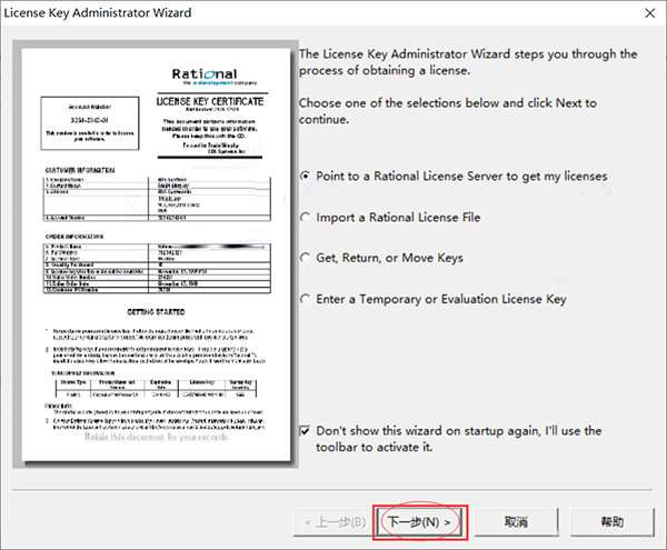 12、这时可打开安装的Rational Rose Enterprise Edition,若还是出现Error,则打开Rational License Key Administrator ,点击工具栏中的第一个工具(Start WIzard),点击下一步,在Server Name中的名字改为自己的计算机名即可。