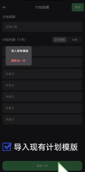 导入模板:如果不想自己一步步设置,点击某一天,选择“导入现有模版”,快速填充计划内容。还能长按某一天拖拽,对计划顺序进行调整。
