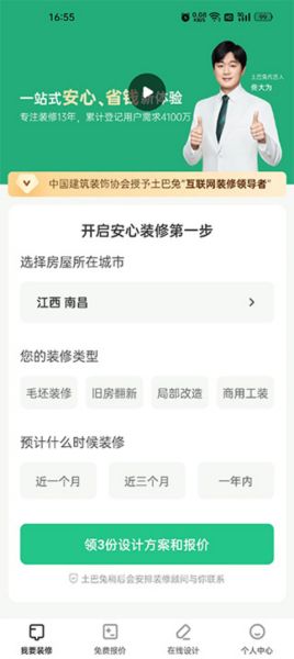 1、在本站下载安装软件,注册登录来到软件首页,在首页填写自己房子的类型可以领三份设计方案和房子装修报价;