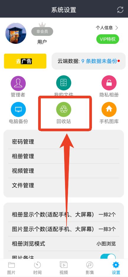 1、来到【设置】页面,点击【回收站】,被删除的照片会暂时放到回收站里面。