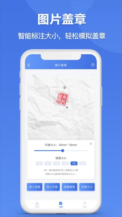 选择背景图片,智能标注印章真实大小,轻松将印章随意盖到图片上。
