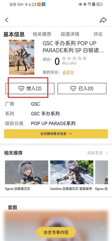 2、进入该模型手办的详情页,点击【想入】按钮;