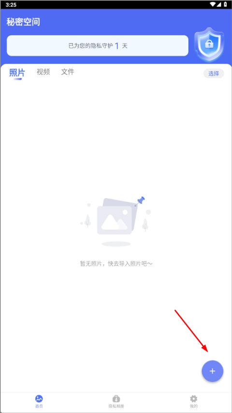 2、接着选择要导入秘密空间的东西,如照片、视频、文件;