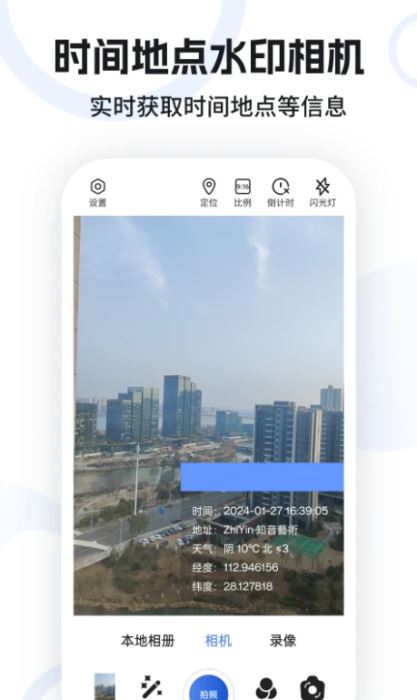 水印定位相机手机端使用的相机软件,这款软件支持一键拍照,水印照片自动生成,一键保存到手机相册等,界面简洁,易于上手,欢迎下载。
