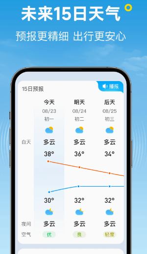 15天预报:可查看15天内的天气状态,温度、风向、空气质量等,了解天气变化为出行保驾护航。