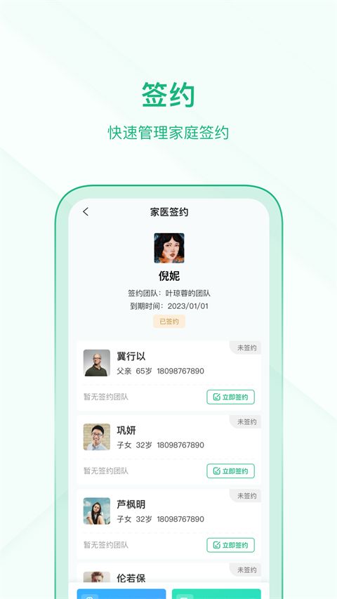 可查找“离我最近”和“离家最近”的医疗机构、找到自己想签约的医生团队,进行签约申请。还可看到为您推荐的资讯。