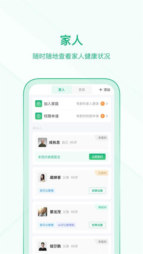 维护个人信息和健康档案,收藏文章和视频,查看或管理家庭成员健康状况,联系客服等。