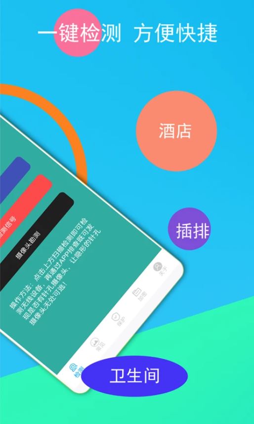 隐形摄像头探测器app是一款很好用的摄像头检测工具,在这里,用户随时可以在线根据自己的需求进行隐形摄像头的检测,为出门在外的我们增添一份安全的保障。软件操作操作便捷,一键便可保护我们的隐私。有需要的朋友可在本站下载使用!