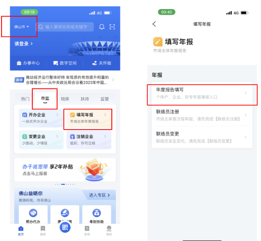 1、点击首页左上角位置信息,选择年报市场主体所在城市,点击【市监】-【填写年报】-【年度报告填写】,完成人脸识别验证,即可进入年报系统。
