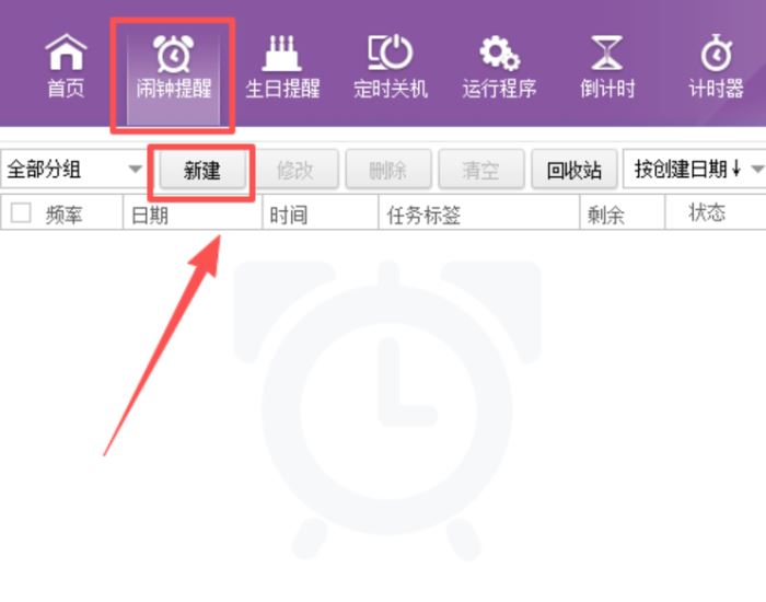 1、选择【闹钟提醒】,点击【新建】,