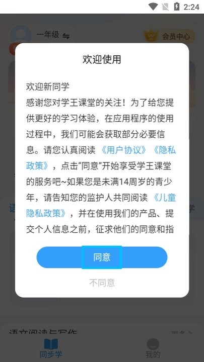 下载打开学王课堂,弹出的内容,点击【同意】;