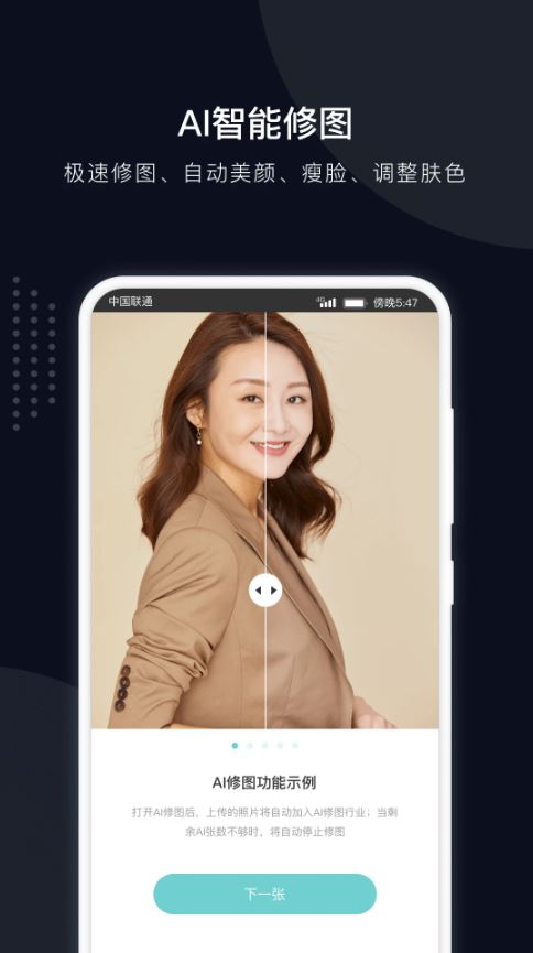 拾光盒子人工AI修图机器人,可极速修图、自动美颜、瘦脸、调整肤色,并且根据性别和年龄作出不同调整。