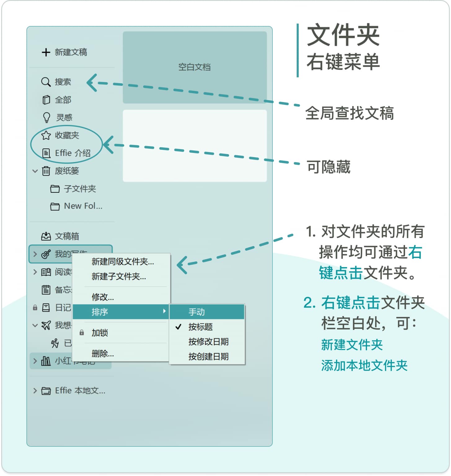 设置文件夹中文稿的排序方式(手动、按标题、按修改日期、按创建日期)