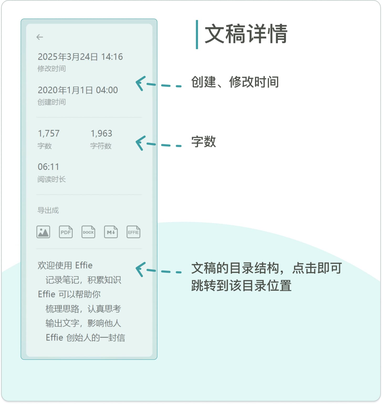 展开文稿详情(查看创建/修改时间、字数统计、目录列表–支持跳转)