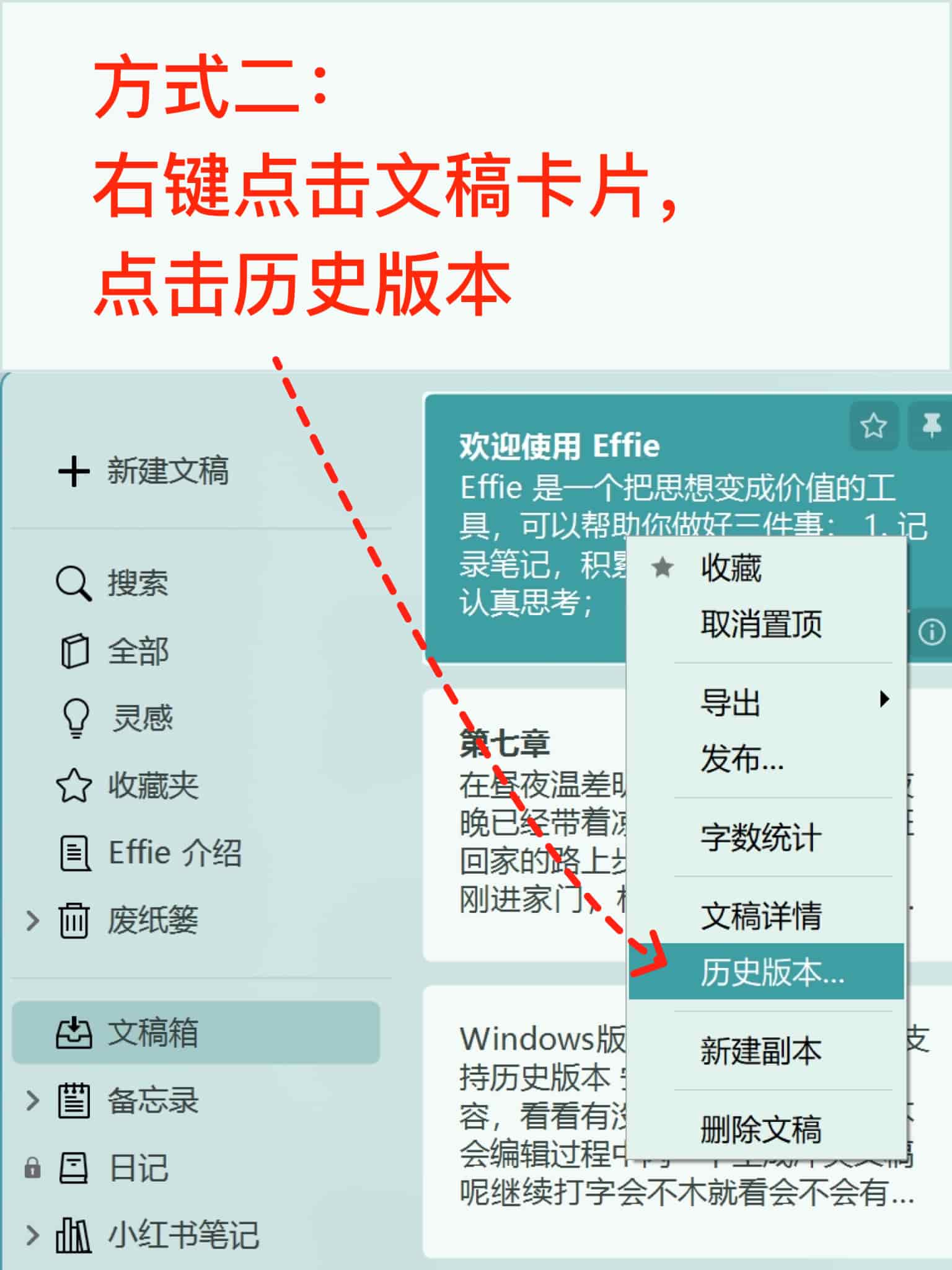 可以通过四种方式(主菜单、快捷键Shift + Ctrl + H、文稿卡片右键菜单、文稿详情面板)打开历史版本查看窗口。